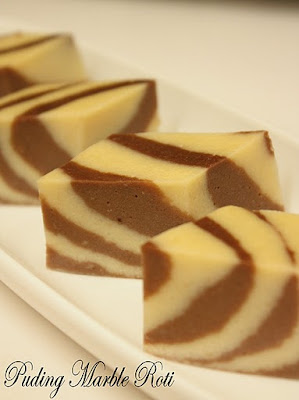 - Tuang ke dalam loyang secara berselang seli. Sesenduk adunan asal kemudian sesenduk lagi adunan coklat. Ulang hingga habis ye, ketika melapis/me'marble'kan hendaklah cepat-cepat ye sebab puding ni mudah membeku.